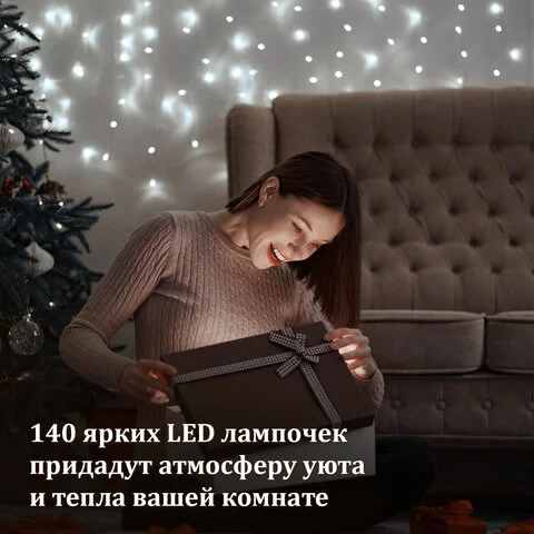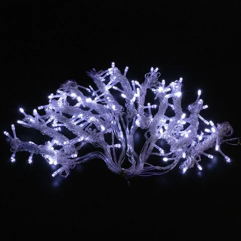 Гирлянда электрическая светодиодная представляет собой светодиоды, соединенные между собой электрическим проводом. Тип конструкции электрогирлянды - 'Штора'. Данный тип конструкции предусматривает наличие основного провода рабочей части электрогирлянды без светодиодов, к которому перпендикулярно присоединены 12 нитей длиной 2 м, на каждой из которых по 12 светодиодов. Длина основного провода рабочей части гирлянды составляет 3 м, длина кабеля питания - 3 м. Количество светодиодных ламп - 144 шт. Лампы сделаны на основе технологии LED, которая является более безопасной и эффективной по сравнению с лампой накаливания.