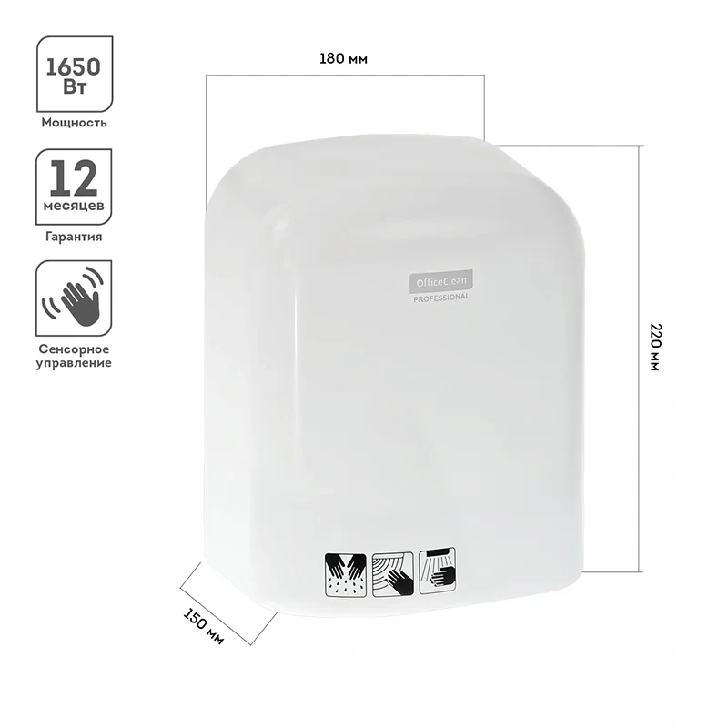 Электросушитель для рук OfficeClean Professional, 1650Вт, сенсорный, белый, ABS-пластик