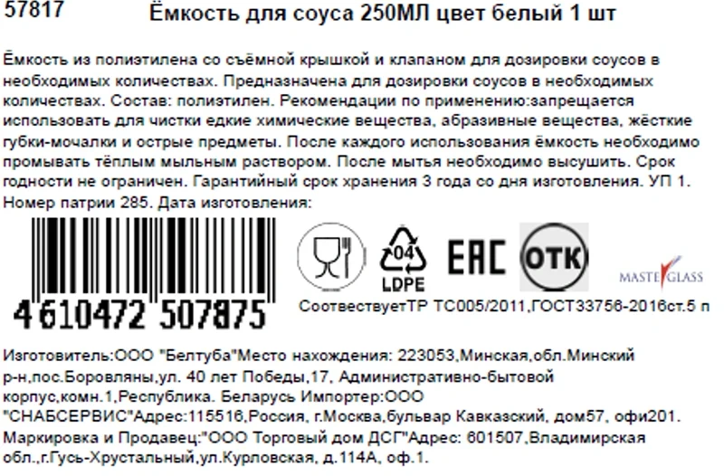 Емкость предназначена для дозировки соусов в необходимых количествах. Модель выполнена из полиэтилена, который обладает прочностью и долговечностью. Он устойчив к перепадам температур, ультрафиолету, воздействию влаги и пыли. В комплекте со съёмной крышкой и клапаном для дозировки соусов в необходимых количествах.