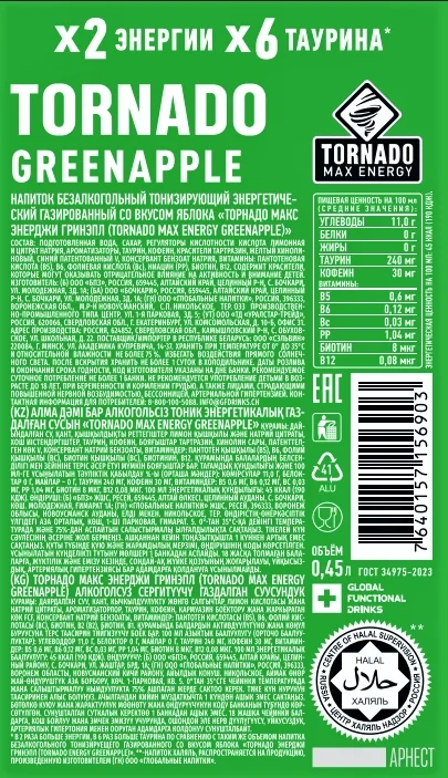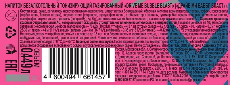 Вода питьевая очищенная, сахар, регуляторы кислотности: кислота лимонная и цитрат натрия, БАД Таурин, натуральные вкусоароматические вещества, масло мяты, ароматизатор пищевой натуральный Тип Лайм, ароматизатор пищевой натуральный. Нейтральная эмульсия (стабилизатор Е414, антиокислители E307 и E320, консервант Е202, регулятор кислотности Е330), антиокислитель - аскорбиновая кислота, экстракт растительный. Кофеин натуральный, премикс витаминный (ниацин, пантотеновая кислота, витамин В6, фолиевая кислота, биотин, витамин В12), консервант - бензоат натрия, концентрированный сок лайма.
