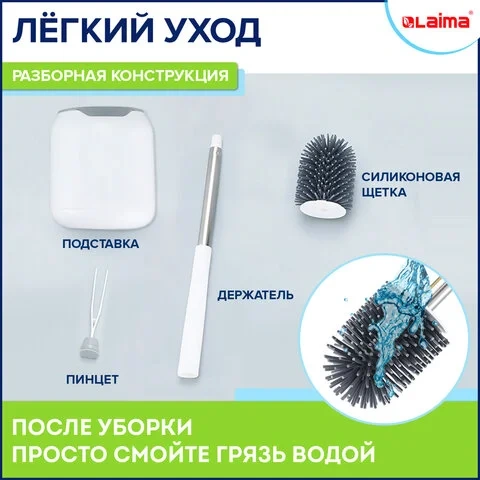 Силиконовый ершик легко справляется с труднодоступными местами. Ерш для унитаза оснащен специальной конструкцией для стекания жидкости, что не позволяет воде и запахам застаиваться в туалете и ванной. Для удобства уборки волос и прочих предметов, ёрш имеет специальные щипцы, которые спрятаны в ручке.