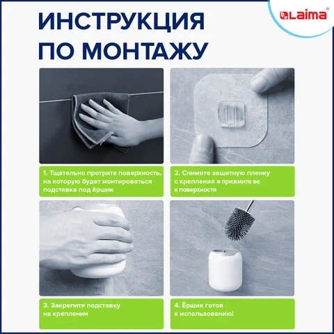 Размер изделия: высота – 42 см, ширина подставки – 10,5 см. Пластиковый держатель с силиконовым ершиком может размещаться на полу, а может крепиться на стену в навесном варианте размещения. В последнем случае вам необходимо очистить и обезжирить поверхность для крепления, смонтировать монтажную наклейку с клеевой основой в месте для размещения и приклеить чашу к наклейке.