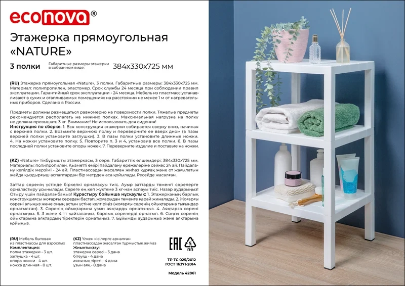 Этажерка Econova Nature прямоугольная белая, 384 x 330 x 725мм