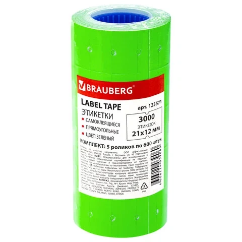 Цвет - зеленый, форма - прямоугольная. Один рулон содержит 600 этикеток размером 21x12 мм. 5 рулонов в комплекте. Поставляются в термоусадочной пленке.