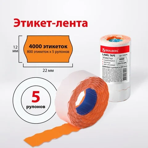 Этикет-лента волнистая Brauberg оранжевые, 22х12мм, 800шт, 5 рулонов