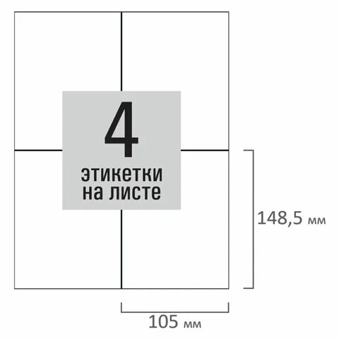 Изготовлены из самоклеящейся матовой бумаги плотностью 80 г/м2. Надежно приклеиваются к поверхности любой формы и материала. Картонная упаковка содержит 100 листов формата А4, на каждом листе – 4 этикетки размером 105х148,5 мм.