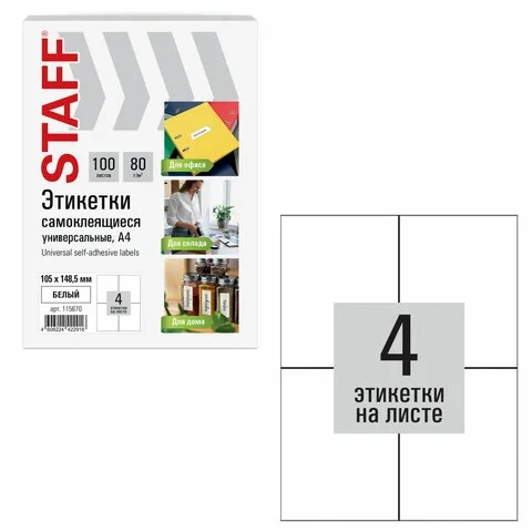 Этикетка самоклеящаяся 105х148,5мм, 4 этикетки, белая, 80г/м2, 100 листов, STAFF BASIC, 115670