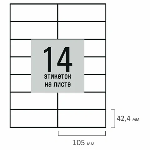 Изготовлены из самоклеящейся матовой бумаги плотностью 80 г/м2. Надежно приклеиваются к поверхности любой формы и материала. Картонная упаковка содержит 50 листов формата А4, на каждом листе – 14 этикеток размером 105х42,4 мм.