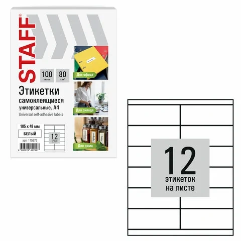 Этикетка самоклеящаяся 105х48мм, 12 этикеток, белая, 80г/м2, 100 листов, STAFF BASIC, 115673