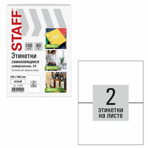 Этикетка самоклеящаяся 210х148,5мм, 2 этикетки, белая, 80г/м2, 100 листов, STAFF BASIC, 115669