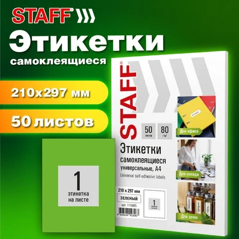 Этикетка самоклеящаяся 210х297мм, 1 этикетка, зеленая, 80г/м2, 50 листов, STAFF BASIC, 115685