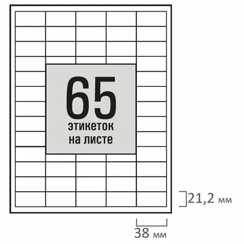 Изготовлены из самоклеящейся матовой бумаги плотностью 80 г/м2. Надежно приклеиваются к поверхности любой формы и материала. Картонная упаковка содержит 100 листов формата А4, на каждом листе – 65 этикеток размером 38х21,2 мм.