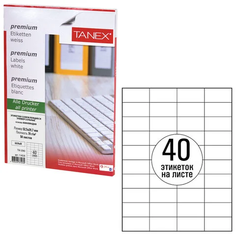 Этикетка самоклеящаяся 52,5х29,7 мм, 40 этикеток, белая, 70 г/м2, 50 листов, TANEX, сырье Финляндия,