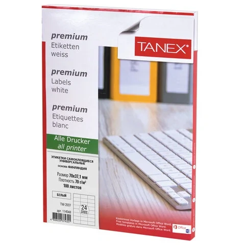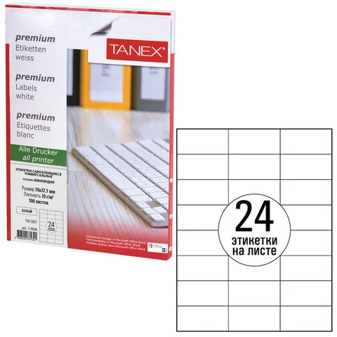 Этикетка самоклеящаяся 70х37,1 мм, 24 этикетки, белая, 70 г/м2, 100 листов, TANEX, сырье Финляндия,