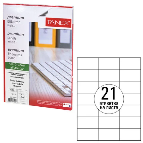 Этикетка самоклеящаяся 70х42,4 мм, 21 этикетка, белая, 70г/м2, 50 листов, TANEX, сырье Финляндия, 11