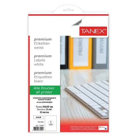 Этикетки самоклеящиеся Tanex 210x297мм, белые, 1 этикетка, 25 листов