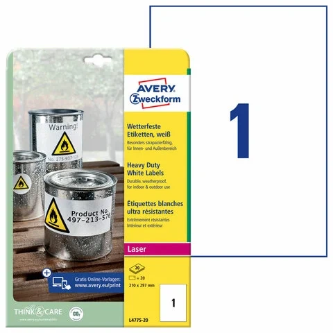 Прочные белые водостойкие этикетки из полиэстера белого цвета плотностью 75 г/м2. Этикетки обладают особой устойчивостью к воздействию загрязняющих веществ, влаги, перепадам температуры. Совместимы с лазерными принтерами. Упаковка содержит 20 листов формата А4, на каждом листе - одна этикетка размером 210х297 мм.