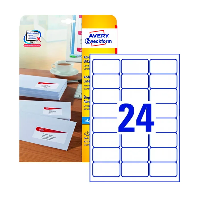 Этикетки адресные Avery Zweckform J8159-25, белые, 63.5 x 33.9мм, 24шт на листе А4, 25 листов