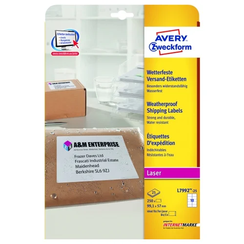 Ваши письма и посылки предназначены для дальней отправки? И вам необходимо убедиться, что к моменту доставки упаковка не испортится, а информация с адресом не смажется? Всепогодные этикетки от Avery особо прочные и устойчивые к воздействию загрязняющих веществ, влаги и перепадов температуры. Идеальное решение для маркировки в экстремальных условиях, где обычная бумага справиться неспособна.