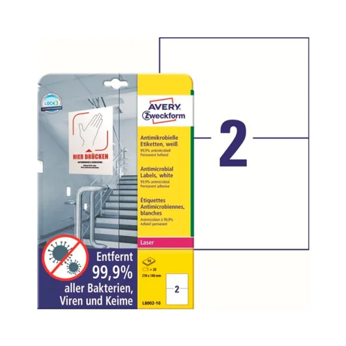 Белые противомикробные пленочные этикетки L8002-10 формата 210x148 мм от AVERY ZWECKFORM удаляют 99.9% вирусов, бактерий и микробов с поверхностей. Водостойкие и прочные. В упаковке 20 противомикробных, надежно приклеивающихся этикеток, всего 10 листов. Эффективность противомикробных этикеток на 99,9% клинически доказана и подтверждена независимыми лабораториями и институтами. Этикетки отлично приклеиваются на различные гладкие поверхности такие как двери, выключатели, звонки, перила, столы, кнопки лифта- любые поверхности общественного использования. Водостойкие, маслостойкие, устойчивы к чистящим средствам и дезинфекторам, выдерживают перепады темератур -20°C до +80°C .