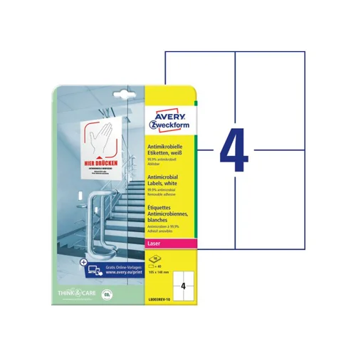 Белые противомикробные пленочные этикетки L8003REV-10 формата 105x148 мм от AVERY ZWECKFORM удаляют 99.9% вирусов, бактерий и микробов с поверхностей. Водостойкие и прочные. В упаковке 10 противомикробных, надежно приклеивающихся этикеток, всего 10 листов. Легко удаляются, не оставляя следов клея на поверхности. Эффективность противомикробных этикеток на 99,9% клинически доказана и подтверждена независимыми лабораториями и институтами. Этикетки отлично приклеиваются на различные гладкие поверхности такие как двери, выключатели, звонки, перила, столы, кнопки лифта- любые поверхности общественного использования. Водостойкие, маслостойкие, устойчивы к чистящим средствам и дезинфекторам, выдерживают перепады темератур -20°C до +80°C .