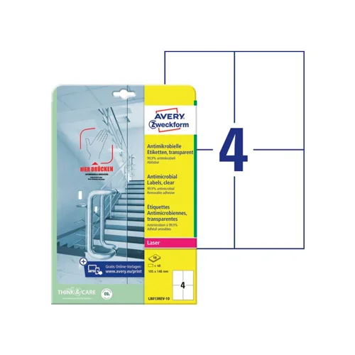 Прозрачные противомикробные пленочные этикетки L8013REV-10 формата 105x148 мм от AVERY ZWECKFORM удаляют 99.9% вирусов, бактерий и микробов с поверхностей. Водостойкие и прочные. В упаковке 10 противомикробных, надежно приклеивающихся этикеток, всего 10 листов. Легко удаляются, не оставляя следов клея на поверхности. Эффективность противомикробных этикеток на 99,9% клинически доказана и подтверждена независимыми лабораториями и институтами. Этикетки отлично приклеиваются на различные гладкие поверхности такие как двери, выключатели, звонки, перила, столы, кнопки лифта- любые поверхности общественного использования. Водостойкие, маслостойкие, устойчивы к чистящим средствам и дезинфекторам, выдерживают перепады темератур -20°C до +80°C .