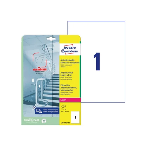 Прозрачные противомикробные пленочные этикетки L8011REV-10 формата 210x297 мм от AVERY ZWECKFORM удаляют 99.9% вирусов, бактерий и микробов с поверхностей. Водостойкие и прочные. В упаковке 10 противомикробных, надежно приклеивающихся этикеток, всего 10 листов. Легко удаляются, не оставляя следов клея на поверхности. Эффективность противомикробных этикеток на 99,9% клинически доказана и подтверждена независимыми лабораториями и институтами. Этикетки отлично приклеиваются на различные гладкие поверхности такие как двери, выключатели, звонки, перила, столы, кнопки лифта- любые поверхности общественного использования. Водостойкие, маслостойкие, устойчивы к чистящим средствам и дезинфекторам, выдерживают перепады темератур -20°C до +80°C .