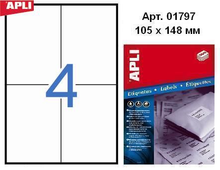 Этикетки APLI, А4, 105х148, 4шт/л, 500л, неуд, прямоуг., белые