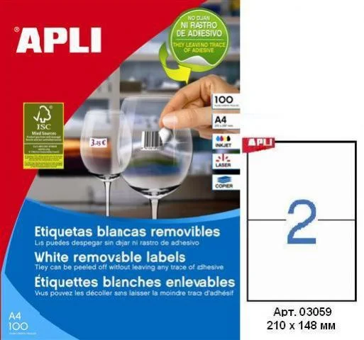 Этикетки APLI, А4, 210х148, 2шт/л, 100л, прямоуг., белые