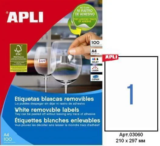 Этикетки APLI, А4, 210х297, 1шт/л, 100л, прямоуг., белые