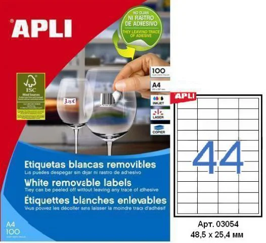 Этикетки APLI, А4, 48,5х25,4, 44шт/л, 100л, прямоуг., белые