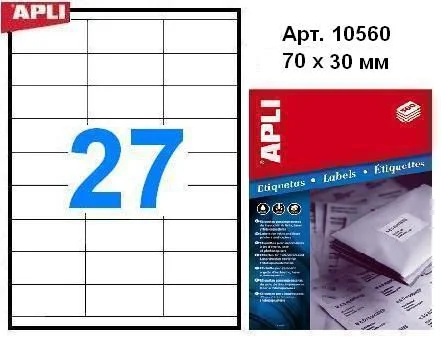 Этикетки APLI, А4, 70x30, 27шт/л, 500л, неуд, прямоуг., белые