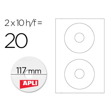 Этикетки APLI, А4, СD-DVD d=117, d=18, 2шт/л, 10л, фотокачество, неуд, глянец, белые