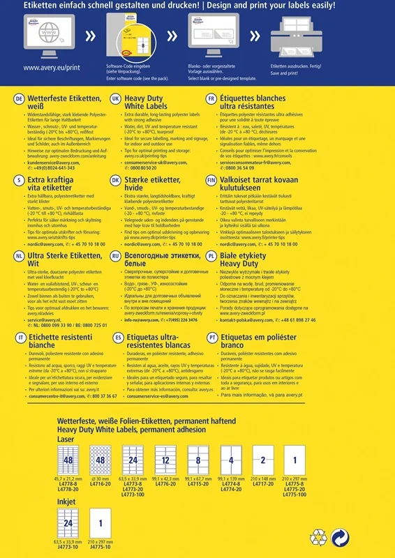 Этикетки Avery Zweckform L4775-8 A4 297x210мм 1шт на листе/196г/м2/8л./белый самоклей. для лазерной