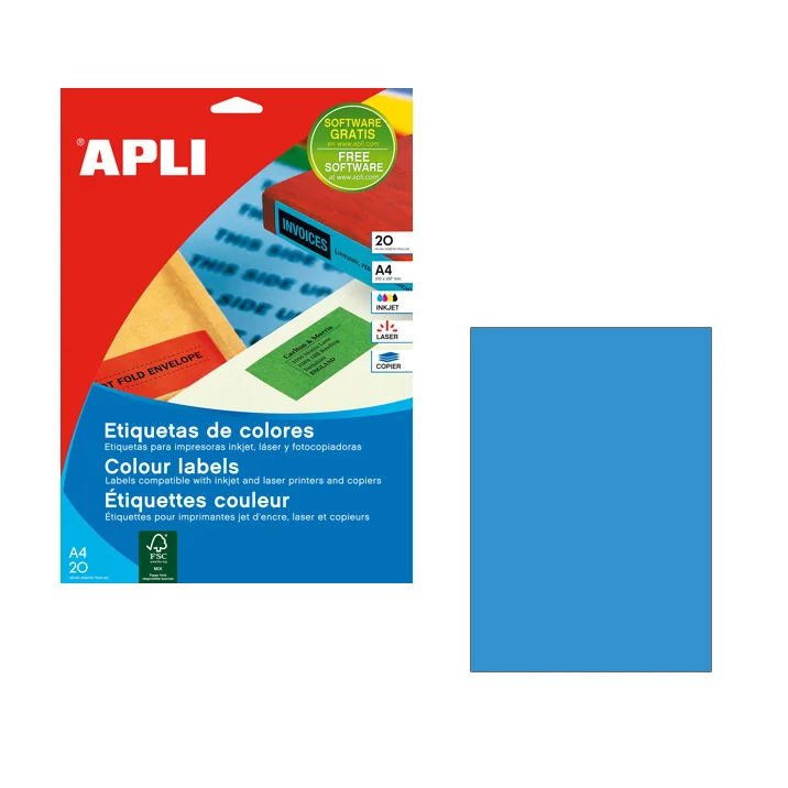 Этикетки цветные Apli 1600, 210х297мм, 20шт, голубые