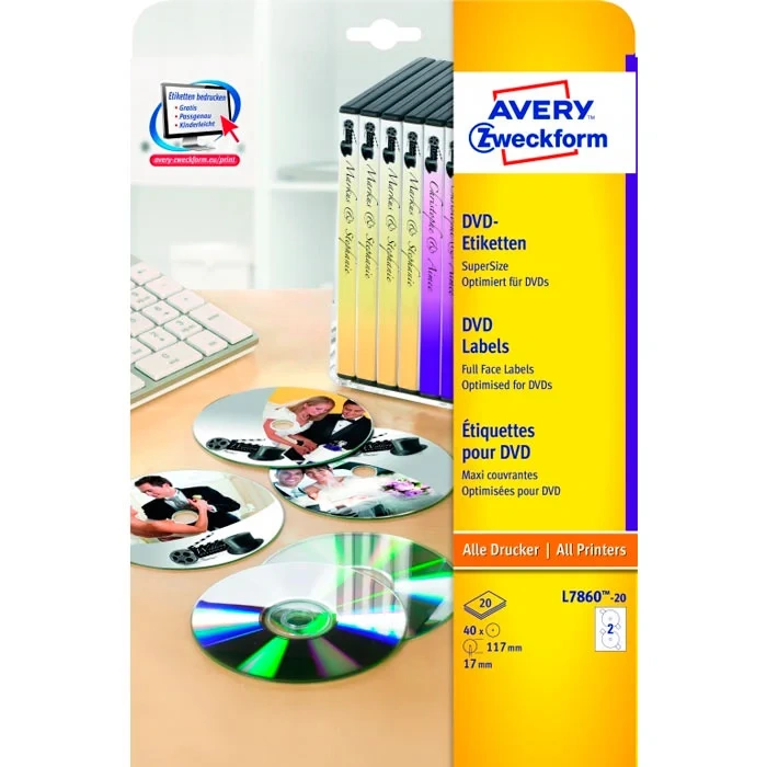 Этикетки для CD/DVD Avery Zweckform L7860-20, белые, d=117мм, 2шт на листе А4, 20 листов