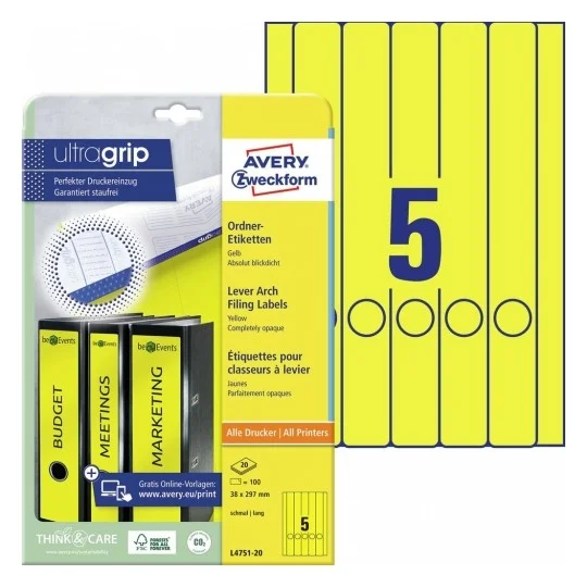 Этикетки для папок Avery Zweckform L4751-20, желтые, 38х297мм, 5шт на листе А4, 20 листов