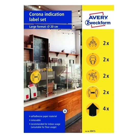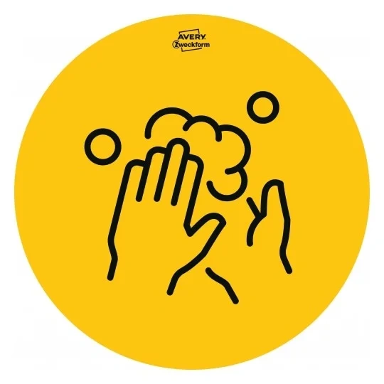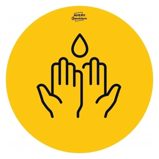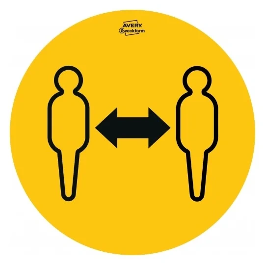 Самоклеящиеся удаляемые бумажные таблички от Avery Zweckform. Идеально подходят для использования в общественных местах именно внутри помещений. Например, в магазинах, кафе, ресторанах, торговых центрах, офисах, жилых домах. Желтые наклейки с черной символикой диаметром 20 см обеспечивают максимальную видимость. Руководящие принципы и правила по соблюдению социального дистанцирования и гигиены в связи с пандемией COVID-19 представлены в виде простых для понимания изображений. В набор входят 5 видов табличек: «мытье рук» (2шт), «маски» (2шт), «дезинфекция рук» (2шт), «соблюдение дистанции» (2шт), «стрелка» (4шт). Ограничения, связанные с предотвращением распространения коронавируса,относятся и к охране здоровья на рабочих местах. Самоклеящиеся указатели значительно облегчают работу компаний и помогают защитить сотрудников и клиентов.