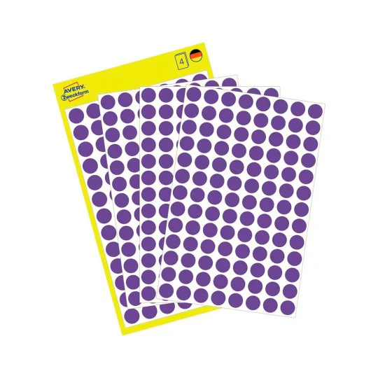 Сиреневые самоклеящиеся точки (арт. 3112) для маркировки диаметром 8 мм от AVERY ZWECKFORM. Идеальное решение для маркировки, организации расписания, сортировки, и планирования встреч. В упаковке 416 круглых клеящихся точках на листах.