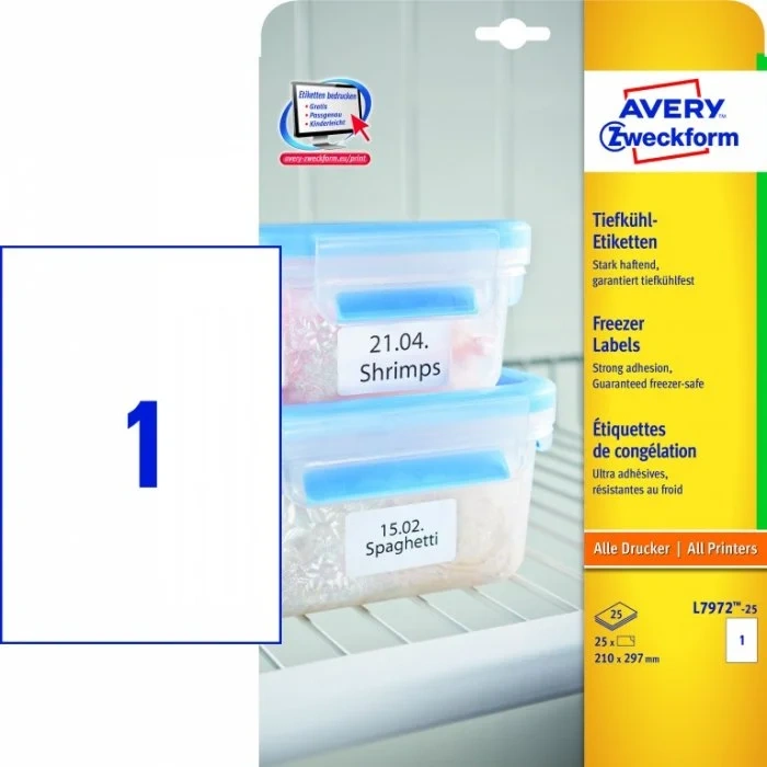 Морозостойкие этикетки от Avery Zweckform предназначены для маркировки в условиях глубокой заморозки. Минимальная температура применения - 20° С, устойчивость к температурам от -50°С до +70°С.