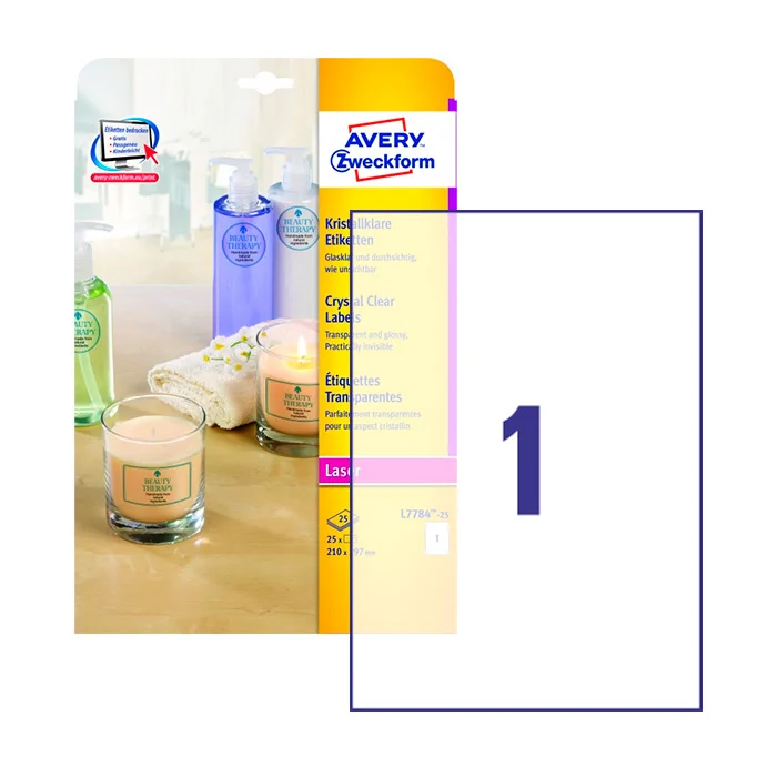 Этикетки прозрачные Avery Zweckform Crystal Clear L7784-25, глянцевые, 210х297мм, 1шт на листе А4, 25 листов