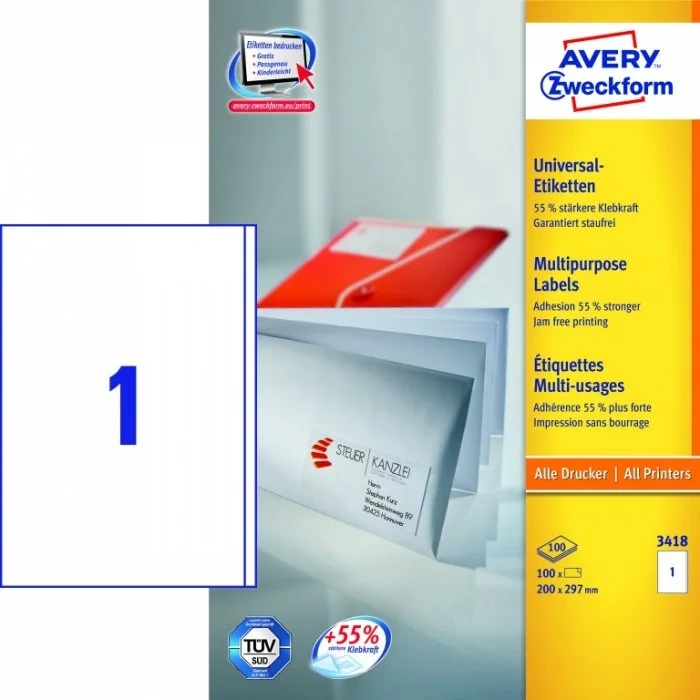 Этикетки самоклеящиеся Avery Zweckform 3418, белые, 200х297мм, 1шт на листе А4, 100 листов