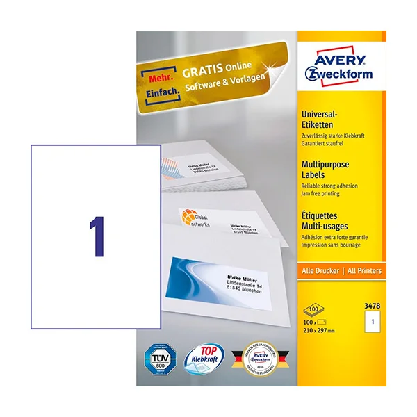 Этикетки самоклеящиеся Avery Zweckform 3478, белые, 210х297мм, 1шт на листе А4, 100 листов