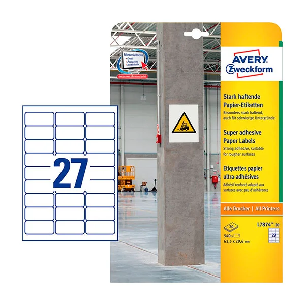 Этикетки самоклеящиеся Avery Zweckform L7874-20, белые, 63.5х29.6мм, 27шт на листе А4, 20 листов