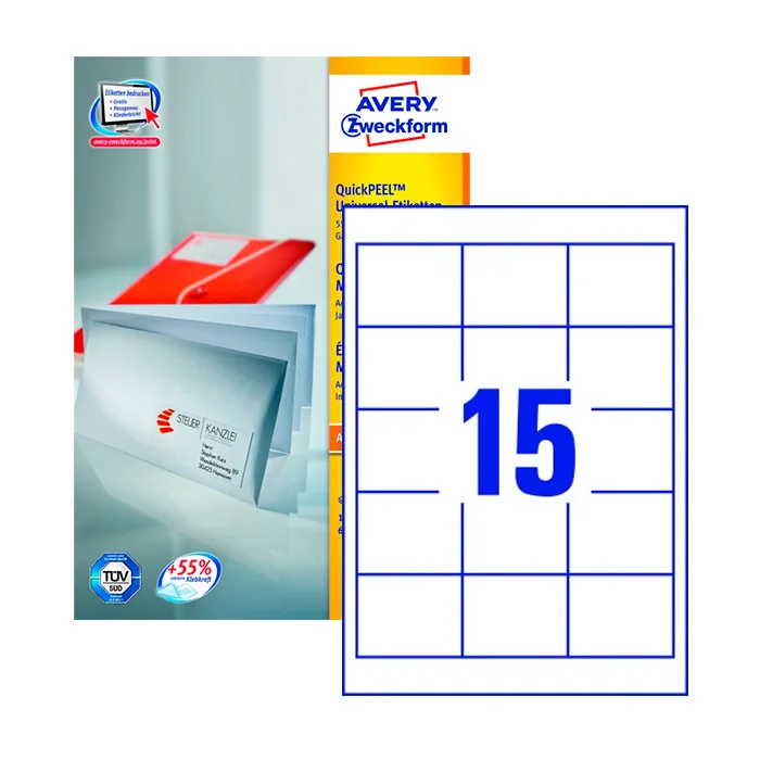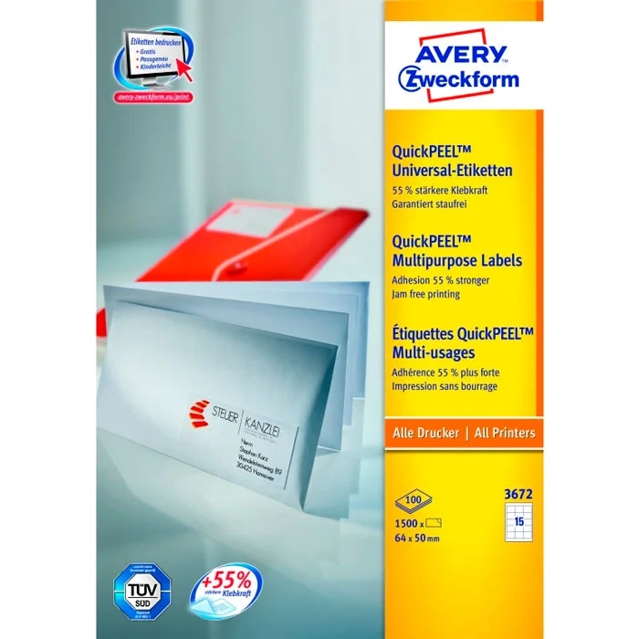 Этикетки самоклеящиеся Avery Zweckform QuickPeel 3672, белые, 64x50мм, 15шт на листе А4, 100 листов