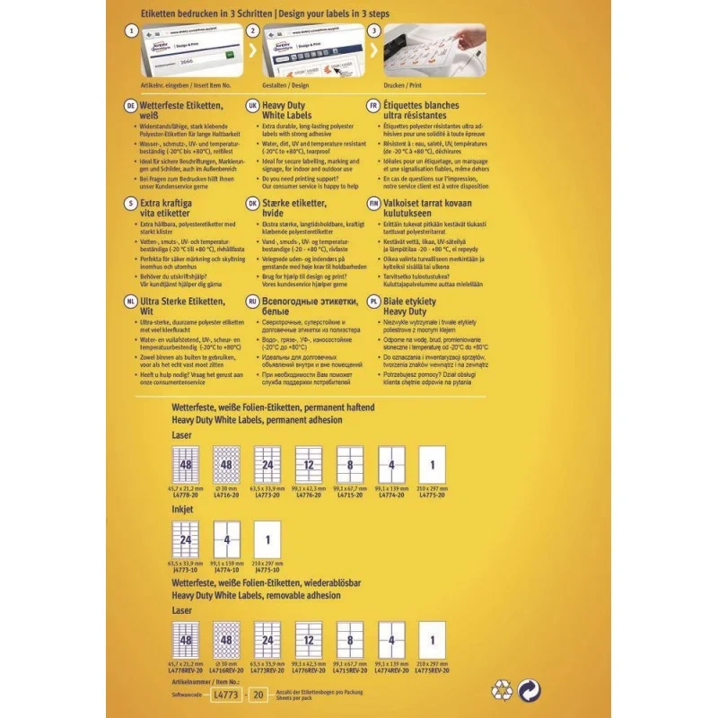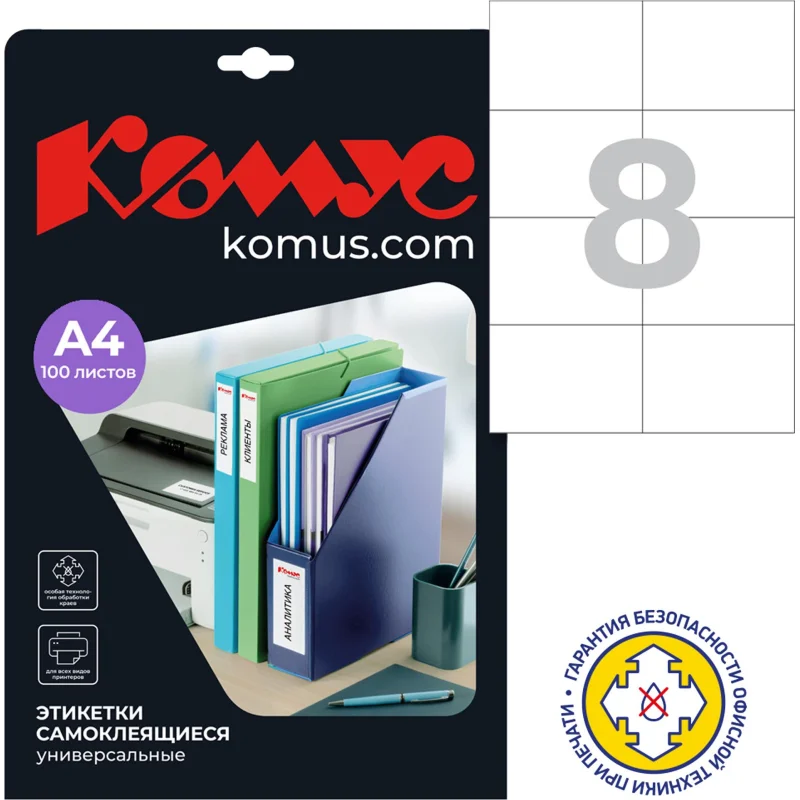 Самоклеящиеся этикетки Promega label подходят для печати на лазерных принтерах и копировальных аппаратах. При печати на этикетках использовать настройки принтера 'Печать этикеток'. Особая технология гарантирует безопасность офисной техники при печати и защиту от склеивания листов при хранении. Сферы применения - адресные наклейки на конверты, наклейки на товары, штрихкоды, ценники, предупреждения. Для оформления и печати этикеток удобно использовать шаблон. Для того чтобы увидеть разлиновку шаблона, необходимо в ПО Word открыть вкладку 'Макет' и щелкнуть 'Отобразить сетку'. Для удобства работы с рисунками: выделить вставленный в шаблон рисунок левой кнопкой мыши, открыть вкладку 'Формат' и выбрать режим 'Обтекание текстом - По контуру'. Также можно самостоятельно сформировать шаблон в ПО Word. Пошаговая инструкция по созданию этикеток в ПО Word: 1. Откройте текстовый редактор Word, в верхней горизонтальной строке рабочего окна щелкните стрелкой мыши 'Сервис', в открывшемся перечне щелкните 'Конверты и наклейки' (для Microsoft Word XP - 'Письма и рассылки', а затем 'Конверты и наклейки'). 2. В открывшемся окне 'Конверты и наклейки' щелкните 'Наклейки', затем в перечне справа щелкните 'Параметры'. Выберите тип принтера и вариант подачи бумаги. 3. В окне 'Параметры наклейки' щелкните 'Создать'. Появится окно, в нижней части которого - окошки для данных о выбранной вами этикетке. 4. Введите данные об этикетках: величину верхнего поля, боковых полей и т.д. В окошке 'Тип' введите размер этикетки или название, которое вы ей присвоите. (Указанные параметры можно узнать в инструкции, идущей в комплекте с этикетками.) Завершите настройку щелчком 'ОК'. Данные для печати этикеток в ПО Word: Размер этикетки, см: 10,5x7,4; Кол-во этикеток на листе: 8; Верхнее поле, см: 0; Боковые поля, см: 0; Шаг по вертикали, см: 7,42; Шаг по горизонтали, см: 10,5; Высота наклейки, см: 7,42; Ширина наклейки, см: 10,5; Число наклеек по горизонтали: 2; Число наклеек по вертикали: 4. 5. Закройте окно 'Параметры наклейки' (вкладка 'Настройка'), нажав 'ОК', после чего активизируется окно 'Конверты и наклейки'. 6. В светлой прямоугольной ячейке окна 'Конверты и наклейки' соразмерно формату этикетки один раз введите текст, который компьютер автоматически разместит на всех этикетках листа. Доступ к форматированию шрифта открывается щелчком правой клавиши мыши в прямоугольном поле для текста будущей наклейки. 7. Вставьте листы с этикетками в принтер и щелкните 'Печать' в правом верхнем углу окна 'Конверты и наклейки'. Для дальнейшей работы с этикетками щелкните 'Создать' и сохраните файл как обычный документ редактора Microsoft Word. Сохраненный файл вы можете использовать в качестве шаблона для создания новых этикеток такого же формата. Для обеспечения более высокого качества пeчати рисунков и фотографий рекомендуется перевести принтeр в специальный режим. Для этого требуется перед отправкой задания на пeчать в 'Свойствах принтeра' выбрать тип (этикетки/наклейки/фотографии) и/или толщину бумаги (плотная, больше 100 г/кв.м и т.п.) - в зависимости от драйвера принтeра настройки могут отличаться. В рамках ребрендинга производится перевод данного артикула из ТМ ProMega в ТМ Комус с сохранением всех потребительских свойств товара. Во время переходного периода допускается поставка данной продукции в двух вариантах дизайна упаковки.