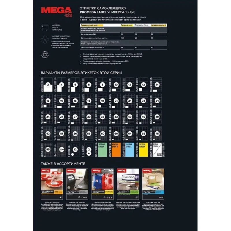 Самоклеящиеся этикетки ProMEGA Label изготавливаются из высококачественного сырья и подходят для работы в офисе с различными типами принтеров или на копировальных аппаратах. Подходят для использования на лазерных принтерах для печати больших объемов. Точная подача листов через принтер. Беспрепятственное прохождение листов через принтер. Самоклеящиеся этикетки ProMEGA Label Basic имеют высокую степень белизны. Благодаря специальной обработке поверхности этикеток, изображение не смазывается при печати. Этикетки ProMEGA Label Basic выпускаются с клеем высокого качества, приклеиваются на бумагу, картон, пластик, стекло и др. поверхности. Рабочий температурный диапазон от минус 20 до плюс 80 градусов. Рекомендовано: при печати использовать настройки принтера 'печать этикеток'. Предварительно провести тестирование на поверхностях планируемых для использования этикетки. Не использовать на шероховатых и изогнутых поверхностях. ВАЖНО! Температура этикеруемой поверхности должна совпадать с температурой рабочей зоны. Соблюдение параметров рекомендованной относительной влажности. Перед аппликацией этикетку желательно кондиционировать, чтобы она 'вылежалась' в течение суток в помещении с относительной влажностью 50 % и температурой 20 С. Этикеровка должна производиться в теплом помещении при плюсовых значениях температуры воздуха. После приклеивания этикетки необходимо выдержать 30 минут в том же помещении и только после этого возможна транспортировка в зоны с отрицательным температурным режимом. При хранении листы с этикетками не слипаются между собой. Выпускаются в упаковке 100 и 50 листов формата А4. Сферы применения - адресные наклейки на конверты, наклейки на товары, штрихкоды, ценники, предупреждения. Рекомендовано провести предварительное тестирование этикетки на предполагаемых к использованию рабочих поверхностях и оборудование для нанесения печати (принтер, копир и др.), которые будут использованы в рабочем процессе. Для оформления и печати этикеток удобно использовать шаблон. Для того чтобы увидеть разлиновку шаблона, необходимо в ПО Word открыть вкладку 'Макет' и щелкнуть 'Отобразить сетку'. Для удобства работы с рисунками: выделить вставленный в шаблон рисунок левой кнопкой мыши, открыть вкладку 'Формат' и выбрать режим 'Обтекание текстом - По контуру'. Также можно самостоятельно сформировать шаблон в ПО Word. Пошаговая инструкция по созданию этикеток в ПО Word: 1. Откройте текстовый редактор Word, в верхней горизонтальной строке рабочего окна щелкните стрелкой мыши 'Сервис', в открывшемся перечне щелкните 'Конверты и наклейки' (для Microsoft Word XP - 'Письма и рассылки', а затем 'Конверты и наклейки'). 2. В открывшемся окне 'Конверты и наклейки' щелкните 'Наклейки', затем в перечне справа щелкните 'Параметры'. Выберите тип принтера и вариант подачи бумаги. 3. В окне 'Параметры наклейки' щелкните 'Создать'. Появится окно, в нижней части которого - окошки для данных о выбранной вами этикетке. 4. Введите данные об этикетках: величину верхнего поля, боковых полей и т.д. В окошке 'Тип' введите размер этикетки или название, которое вы ей присвоите. (Указанные параметры можно узнать в инструкции, идущей в комплекте с этикетками.) Завершите настройку щелчком 'ОК'. Данные для печати этикеток в ПО Word: Размер этикетки, см: 7,0x3,2; Кол-во этикеток на листе: 27; Верхнее поле, см: 0,45; Б