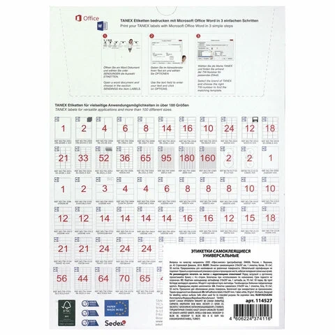 Самоклеящиеся этикетки ProMEGA Label изготавливаются из высококачественного сырья и подходят для работы в офисе с различными типами принтеров или на копировальных аппаратах. Подходят для использования на лазерных принтерах для печати больших объемов. Точная подача листов через принтер гарантирует беспрепятственное прохождение листов через принтер.Самоклеящиеся этикетки ProMEGA Label имеют высокую степень белизны. Благодаря специальной обработке поверхности этикеток, изображение не смазывается при печати.Этикетки ProMEGA Label выпускаются с акриловым клеем высокого качества, приклеиваются на бумагу, картон, пластик, стекло и др. поверхности.Рабочий температурный диапазон от минус 20 до плюс 120 градусов.Рекомендовано: при печати использовать настройки принтера 'печать этикеток'. Предварительно провести тестирование на поверхностях планируемых для использования этикетки. Не использовать на шероховатых и изогнутых поверхностях.ВАЖНО! Температура этикеруемой поверхности должна совпадать с температурой рабочей зоны. Соблюдение параметров рекомендованной относительной влажности. Перед аппликацией этикетку желательно кондиционировать, чтобы она 'вылежалась' в течение суток в помещении с относительной влажностью 50 % и температурой 20 С. Этикеровка должна производиться в теплом помещении при плюсовых значениях температуры воздуха. После приклеивания этикетки необходимо выдержать 30 минут в том же помещении и только после этого возможна транспортировка в зоны с отрицательным температурным режимом.При хранении листы с этикетками не слипаются между собой. Выпускаются в упаковке 100 и 25 листов формата А4.Сферы применения - адресные наклейки на конверты, наклейки на товары, штрихкоды, ценники, предупреждения.Рекомендовано провести предварительное тестирование этикетки на предполагаемых к использованию рабочих поверхностях и оборудование для нанесения печати (принтер, копир и др.), которые будут использованы в рабочем процессе.Для оформления и печати этикеток удобно использовать шаблон. Для того чтобы увидеть разлиновку шаблона, необходимо в ПО Word открыть вкладку 'Макет' и щелкнуть 'Отобразить сетку'. Для удобства работы с рисунками: выделить вставленный в шаблон рисунок левой кнопкой мыши, открыть вкладку 'Формат' и выбрать режим 'Обтекание текстом - По контуру'.Также можно самостоятельно сформировать шаблон в ПО Word.Пошаговая инструкция по созданию этикеток в ПО Word:1. Откройте текстовый редактор Word, в верхней горизонтальной строке рабочего окна щелкните стрелкой мыши 'Сервис', в открывшемся перечне щелкните 'Конверты и наклейки' (для Microsoft Word XP - 'Письма и рассылки', а затем 'Конверты и наклейки').2. В открывшемся окне 'Конверты и наклейки' щелкните 'Наклейки', затем в перечне справа щелкните 'Параметры'. Выберите тип принтера и вариант подачи бумаги.3. В окне 'Параметры наклейки' щелкните 'Создать'. Появится окно, в нижней части которого - окошки для данных о выбранной вами этикетке.4. Введите данные об этикетках: величину верхнего поля, боковых полей и т.д. В окошке 'Тип' введите размер этикетки или название, которое вы ей присвоите. (Указанные параметры можно узнать в инструкции, идущей в комплекте с этикетками.) Завершите настройку щелчком 'ОК'.Данные для печати этикеток в ПО Word: Размер этикетки, см: 7,0x3,7; Кол-во этикеток на листе: 24; Верхнее поле, 