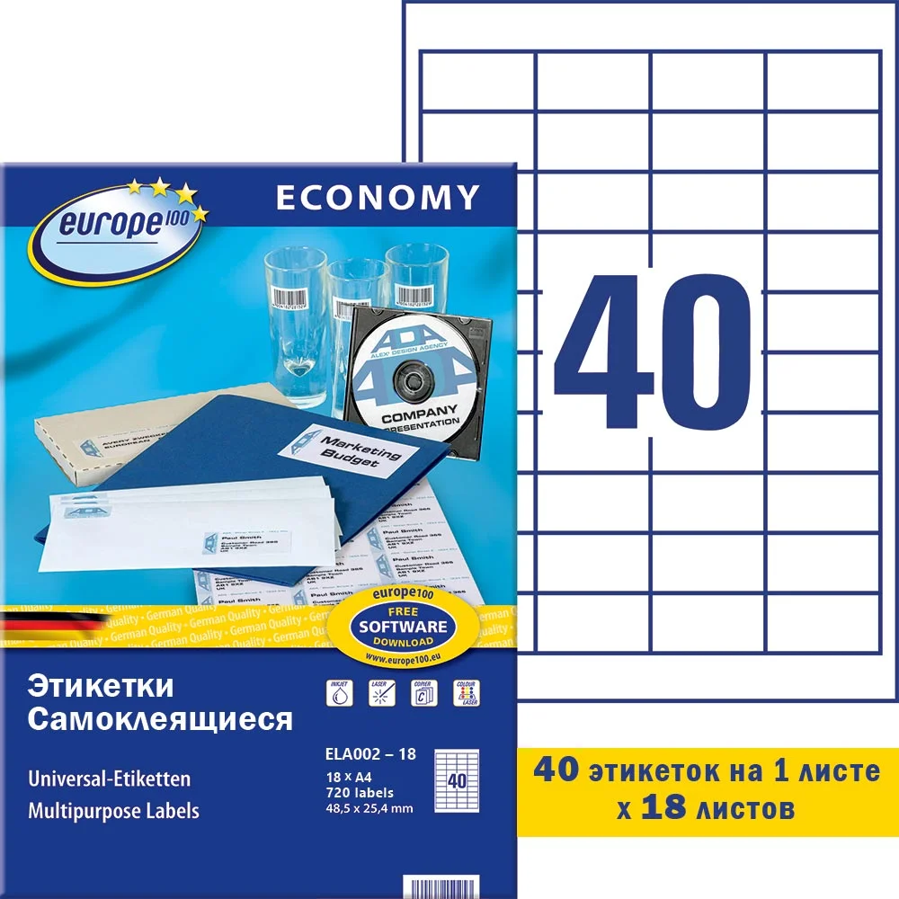 Самоклеящиеся этикетки ProMEGA Label изготавливаются из высококачественного сырья и подходят для работы в офисе с различными типами принтеров или на копировальных аппаратах. Подходят для использования на лазерных принтерах для печати больших объемов. Точная подача листов через принтер гарантирует беспрепятственное прохождение листов через принтер. Самоклеящиеся этикетки ProMEGA Label имеют высокую степень белизны. Благодаря специальной обработке поверхности этикеток, изображение не смазывается при печати. Этикетки ProMEGA Label выпускаются с акриловым клеем высокого качества, приклеиваются на бумагу, картон, пластик, стекло и др. поверхности. Рабочий температурный диапазон от минус 20 до плюс 120 градусов. Рекомендовано: при печати использовать настройки принтера 'печать этикеток'. Предварительно провести тестирование на поверхностях планируемых для использования этикетки. Не использовать на шероховатых и изогнутых поверхностях. ВАЖНО! Температура этикеруемой поверхности должна совпадать с температурой рабочей зоны. Соблюдение параметров рекомендованной относительной влажности. Перед аппликацией этикетку желательно кондиционировать, чтобы она 'вылежалась' в течение суток в помещении с относительной влажностью 50 % и температурой 20 С. Этикеровка должна производиться в теплом помещении при плюсовых значениях температуры воздуха. После приклеивания этикетки необходимо выдержать 30 минут в том же помещении и только после этого возможна транспортировка в зоны с отрицательным температурным режимом.При хранении листы с этикетками не слипаются между собой. Выпускаются в упаковке 100 и 25 листов формата А4. Сферы применения - адресные наклейки на конверты, наклейки на товары, штрихкоды, ценники, предупреждения. Рекомендовано провести предварительное тестирование этикетки на предполагаемых к использованию рабочих поверхностях и оборудование для нанесения печати (принтер, копир и др.), которые будут использованы в рабочем процессе. Для оформления и печати этикеток удобно использовать шаблон. Для того чтобы увидеть разлиновку шаблона, необходимо в ПО Word открыть вкладку 'Макет' и щелкнуть 'Отобразить сетку'. Для удобства работы с рисунками: выделить вставленный в шаблон рисунок левой кнопкой мыши, открыть вкладку 'Формат' и выбрать режим 'Обтекание текстом - По контуру'. Также можно самостоятельно сформировать шаблон в ПО Word. Пошаговая инструкция по созданию этикеток в ПО Word: 1. Откройте текстовый редактор Word, в верхней горизонтальной строке рабочего окна щелкните стрелкой мыши 'Сервис', в открывшемся перечне щелкните 'Конверты и наклейки' (для Microsoft Word XP - 'Письма и рассылки', а затем 'Конверты и наклейки'). 2. В открывшемся окне 'Конверты и наклейки' щелкните 'Наклейки', затем в перечне справа щелкните 'Параметры'. Выберите тип принтера и вариант подачи бумаги. 3. В окне 'Параметры наклейки' щелкните 'Создать'. Появится окно, в нижней части которого - окошки для данных о выбранной вами этикетке. 4. Введите данные об этикетках: величину верхнего поля, боковых полей и т.д. В окошке 'Тип' введите размер этикетки или название, которое вы ей присвоите. (Указанные параметры можно узнать в инструкции, идущей в комплекте с этикетками.) Завершите настройку щелчком 'ОК'. Данные для печати этикеток в ПО Word: Размер этикетки, см: 7,0x5,7; Кол-во этикеток на листе: 15; Верхн