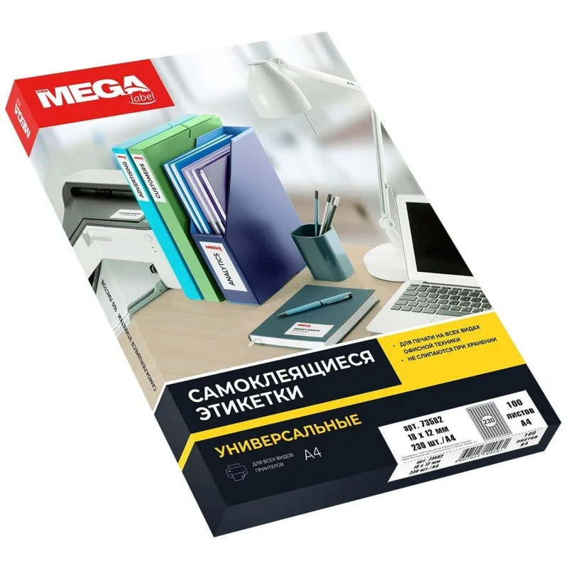 Самоклеящиеся этикетки ProMEGA Label изготавливаются из высококачественного сырья и подходят для работы в офисе с различными типами принтеров или на копировальных аппаратах. Подходят для использования на лазерных принтерах для печати больших объемов. Точная подача листов через принтер гарантирует беспрепятственное прохождение листов через принтер.Самоклеящиеся этикетки ProMEGA Label имеют высокую степень белизны. Благодаря специальной обработке поверхности этикеток, изображение не смазывается при печати.Этикетки ProMEGA Label выпускаются с акриловым клеем высокого качества, приклеиваются на бумагу, картон, пластик, стекло и др. поверхности.Рабочий температурный диапазон от минус 20 до плюс 120 градусов.Рекомендовано: при печати использовать настройки принтера 'печать этикеток'. Предварительно провести тестирование на поверхностях планируемых для использования этикетки. Не использовать на шероховатых и изогнутых поверхностях.ВАЖНО! Температура этикеруемой поверхности должна совпадать с температурой рабочей зоны. Соблюдение параметров рекомендованной относительной влажности. Перед аппликацией этикетку желательно кондиционировать, чтобы она 'вылежалась' в течение суток в помещении с относительной влажностью 50 % и температурой 20 С. Этикеровка должна производиться в теплом помещении при плюсовых значениях температуры воздуха. После приклеивания этикетки необходимо выдержать 30 минут в том же помещении и только после этого возможна транспортировка в зоны с отрицательным температурным режимом.При хранении листы с этикетками не слипаются между собой. Выпускаются в упаковке 100 и 25 листов формата А4.Сферы применения - адресные наклейки на конверты, наклейки на товары, штрихкоды, ценники, предупреждения.Рекомендовано провести предварительное тестирование этикетки на предполагаемых к использованию рабочих поверхностях и оборудование для нанесения печати (принтер, копир и др.), которые будут использованы в рабочем процессе.Для оформления и печати этикеток удобно использовать шаблон. Для того чтобы увидеть разлиновку шаблона, необходимо в ПО Word открыть вкладку 'Макет' и щелкнуть 'Отобразить сетку'. Для удобства работы с рисунками: выделить вставленный в шаблон рисунок левой кнопкой мыши, открыть вкладку 'Формат' и выбрать режим 'Обтекание текстом - По контуру'.Также можно самостоятельно сформировать шаблон в ПО Word.Пошаговая инструкция по созданию этикеток в ПО Word:1. Откройте текстовый редактор Word, в верхней горизонтальной строке рабочего окна щелкните стрелкой мыши 'Сервис', в открывшемся перечне щелкните 'Конверты и наклейки' (для Microsoft Word XP - 'Письма и рассылки', а затем 'Конверты и наклейки').2. В открывшемся окне 'Конверты и наклейки' щелкните 'Наклейки', затем в перечне справа щелкните 'Параметры'. Выберите тип принтера и вариант подачи бумаги.3. В окне 'Параметры наклейки' щелкните 'Создать'. Появится окно, в нижней части которого - окошки для данных о выбранной вами этикетке.4. Введите данные об этикетках: величину верхнего поля, боковых полей и т.д. В окошке 'Тип' введите размер этикетки или название, которое вы ей присвоите. (Указанные параметры можно узнать в инструкции, идущей в комплекте с этикетками.) Завершите настройку щелчком 'ОК'.Данные для печати этикеток в ПО Word: Размер этикетки, см: 1,8x1,2; Кол-во этикеток на листе: 230; Верхнее поле, 